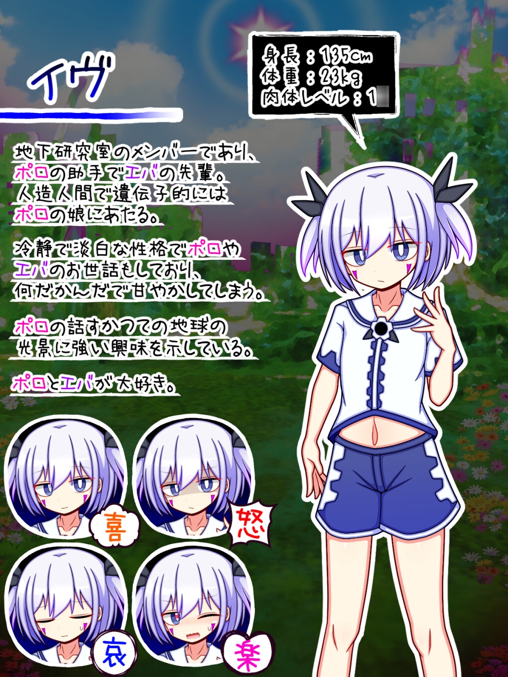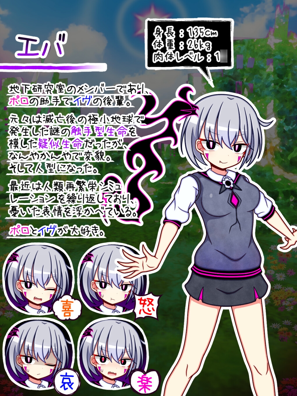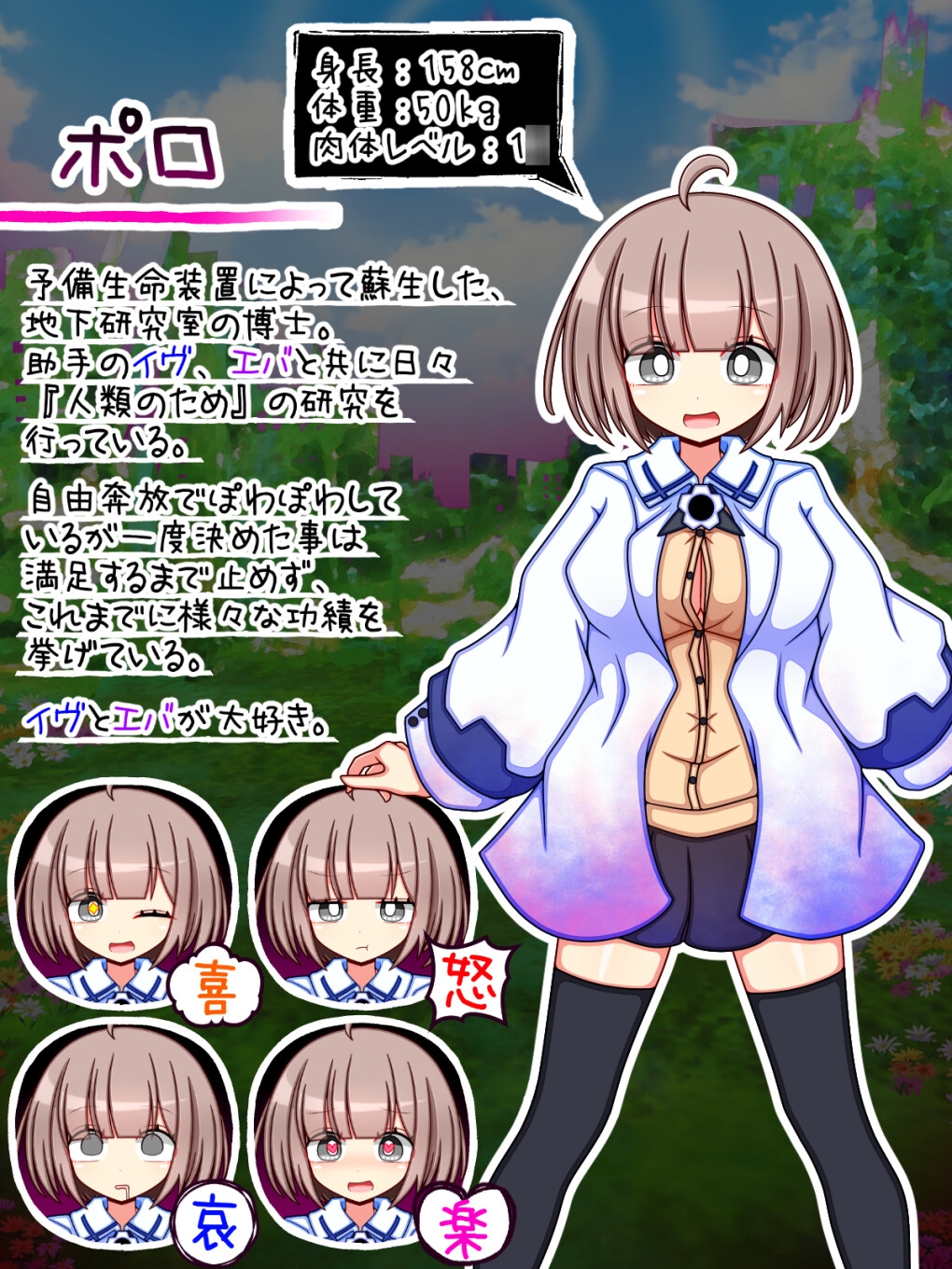 人造人間であるイヴと元触手型疑似生命のエバを助手として従え、地球再興・人類再繫栄を目標に偏に『人類のため』の研究を重ねている。