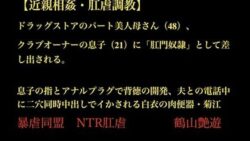 アナル 【近親相姦・肛虐調教】 ドラッグストアのパート美人母さん(48)、 クラブオーナーの息子(21)に「肛門奴●」として差し出される。 息子の指とアナルプラグで背徳の開発、夫との電話中に二穴同時中出しでイかされる白衣の肉便器・菊江